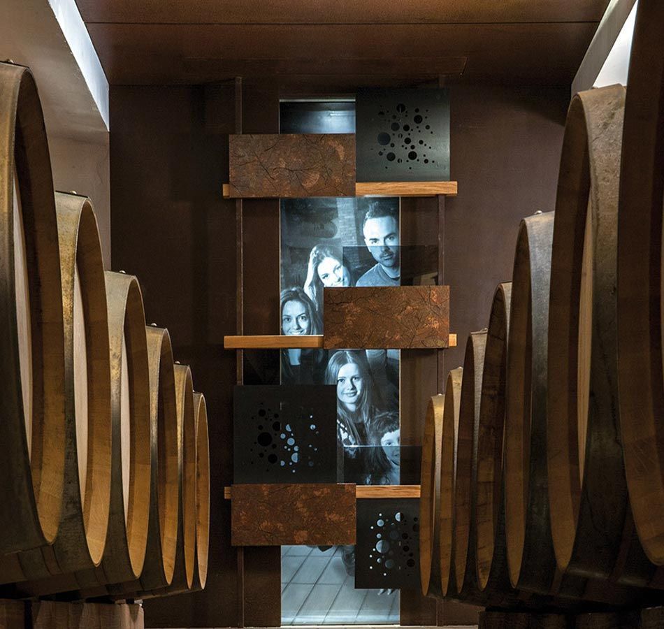 Der Keller scheint ein Geflecht von Vergangenheit und Gegenwart zu sein, in dem modernes Design und Innovation in der Weinherstellung ein Konzept von motivierender Tradition und einer Zukunft aus der Vergangenheit vermitteln.