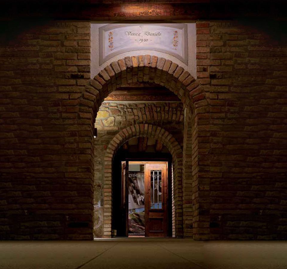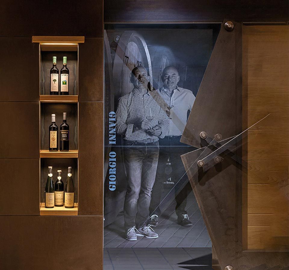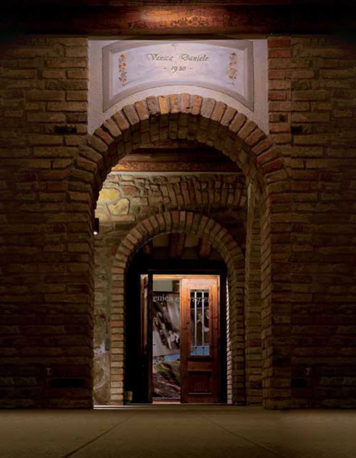Nicht nur eine Metapher, sondern das Emblem eines Konzepts, das sich um die tief empfundene Identität dreht, unsere Ursprünge als Winzer und ein greifbares Zeugnis durch die antike Tür des „Heims“ [Danieles Tür], die meisterhaft restauriert wurde und mit der Ornella Venica eng verbunden ist, weil sie eine tiefe Bedeutung hat. Das Symbol eines neuen Weges, eine Grenzlinie zwischen zwei Welten, eine miteinander verbundene Realität.